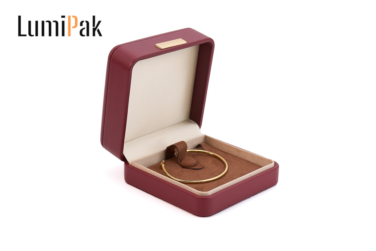酒红色PU金属扣圆角手镯盒